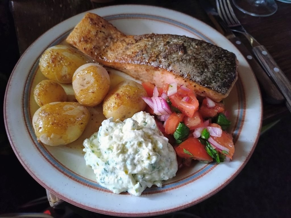 Till lördagsmiddag blev det stekt laxfilé med kokt potatis och en kall sås med saltgurka och curry bland annat.... fantastiskt gott! 🙏💕