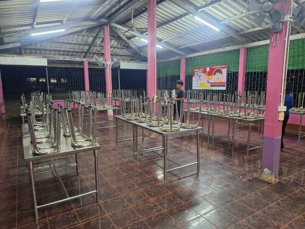 Nu har de nya borden och pallarna kommit på plats hos pojkarna. Nya skolväskor-ryggsäckar överlämnades till pojkarna av personalen i förrgår. Fick frågan om vi kunde ordna en white-board vilket gick snabbt att ordna 😉 Dubbelsidigt, storlek 180x90 cm på stativ med hjul. Nu blir det också strax SmartTV vilket saknas, verkligen behövs. Tack vare era generösa bidrag har vi kunnat höja standarden lite grann på pojkhemmet. Stort TACK igen. De sju rostfria borden levererades dirket från TPN Group som tillverkade till rabatterat pris, precis som ifjol till flickhemmet. Det blev även 60 st rostfria pallar till matsalen. Här är matsalen med nya bord-pallar.