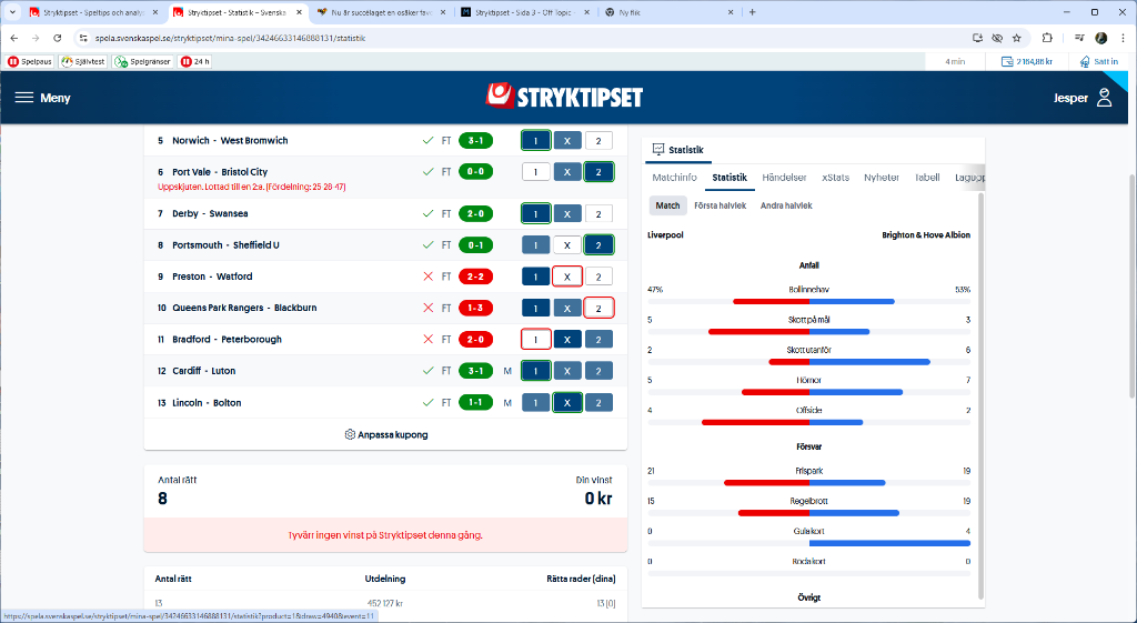 Då var det dags igen, rätt många favoriter på kupongen (enligt mina ögon) så jag kommer gå på dom känns det som. Mina säkra: Man C. Nu när Arses franska nerver börjar komma fram och man tar in poäng varenda omgång så fortsätter man vinna. Chelsea. Dom bör slå ett Burnley som i princip är avsågat från att bli kvar i PL. Middlesbrough. Dom möter ett Oxford som gjort ett mål på dom 5 sista matcherna vars enda chans är ett spela destruktivt. Millwall. Ett överaskningslag milt sagt, ingen skulle tro att dom skulle ligga på 3:e plats nu, Portsmouth har sprattlat till enstaka gång men har 13 st. på skade listan. Några luriga: West Ham - Bournemouth. Två lag som går bra för tillfället, liten fördel West Ham som måste undvika nedflyttning men jag helgarderar 1X2. Brentford - Brighton. Brentford går riktigr bra för tillfället medans Brighton hackar, Brighton har inte gjort ett mål på 3 sista matcherna 1X. Southampton - Charlton. En match som Southampton bör vinna men jag litar inte alls på dom 1X. Watford - Derby. Watford har inte en visnt sedan nyår men 5 raka vinster mot just Derby? svårt så jag helgarderar.