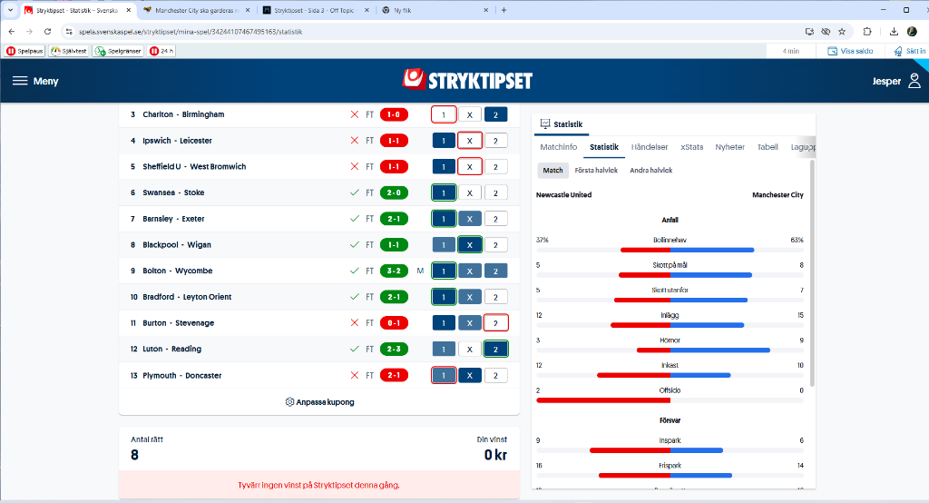 Då var det jackpot omgång igen 13 miljoner, svårigheten är hur man ska värdera matcherna? dom 3 första borde vara spikar på Man C, Arsenal och Chelsea. Men t.ex. West Ham har ingen förlust på dom 5 sista hemma? Everton har en oavgjord och fyra vinster på dom 5 sista borta, sist Newcastle som har 3 vinster och två förluster på dom 5 sista borta? Det lutar åt att jag garderar upp favoriterna och tar lite chansspiker istället. Mina säkra: Bournemouth. det här ska man vinna, jag ska passa på att varna för att Burnley sprattlat till lite mot slutet men jag tar Bornemouth säker ändå på form. Leicester. Detta är en chansspik men QPR har en väldigt många spelare, och några av dessa nyckelspelare, på sim skadelista. Millwall. Årets överaskning kan man säga, dom slåss för direktuppflyttning, när dessutom Blackburn måste gå framåt för att slippa kvalplats så spikar jag. Norwich. Dom går på som en ångvält efter årskiftet, preston har en oavgjord och fyra förluster på dom fem senaste. Några luriga: West Ham - Man City. City har en hemmamatch mot Real Madrid i veckan så Pep snudd på måste rotera truppen, det öppnar upp för ett West Ham som vaknat 1X2. Arsenal - Everton. En matchbild där Everton inte är spelförande är plus för Everton, men mer än 1X blir det inte. Chelsea - Newcastle. Chelsea brakade ihop på 20 minuter mot PSG och släppte in 3 mål! så vi får se hur det påverka dom? Newcastle har en chans 1 2. Birmingham - Sheffield Utd. Svårbedömd match ? jag gör det lätt för mig och helgarderar 1X2.
