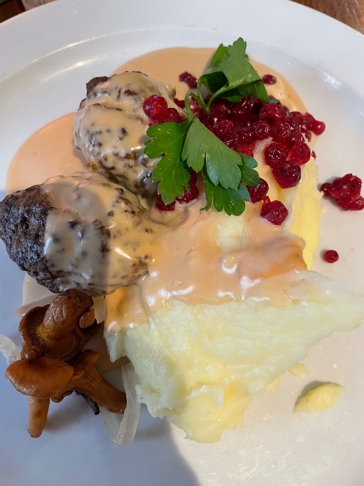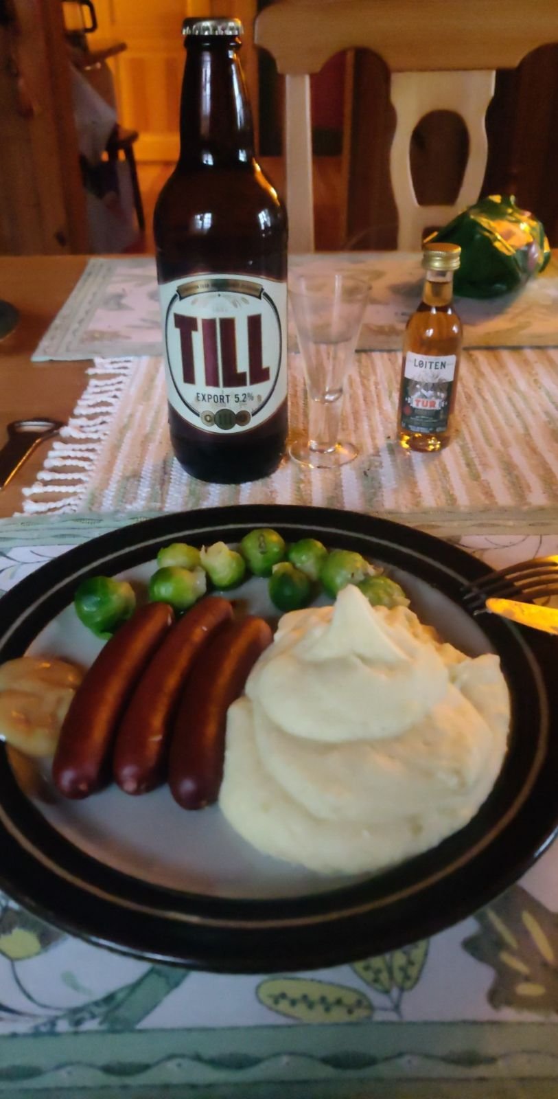Ingen grädde i moset men väl med smör. Äntligen korv med mos å de här med brysselkål är ju fantastiskt. Sen kan jag rekommendera dom här småflaskorna med Norsk akvavit.
