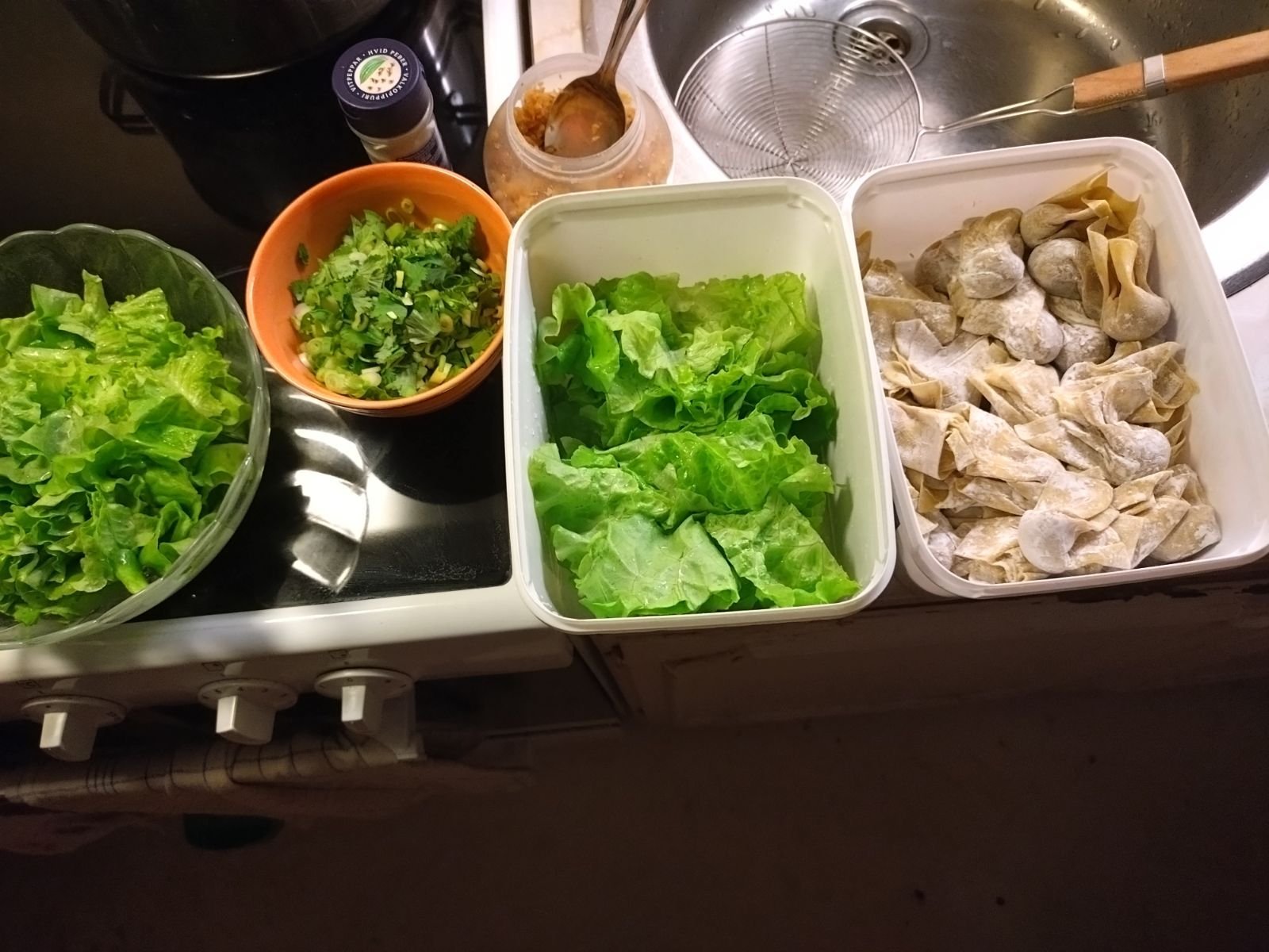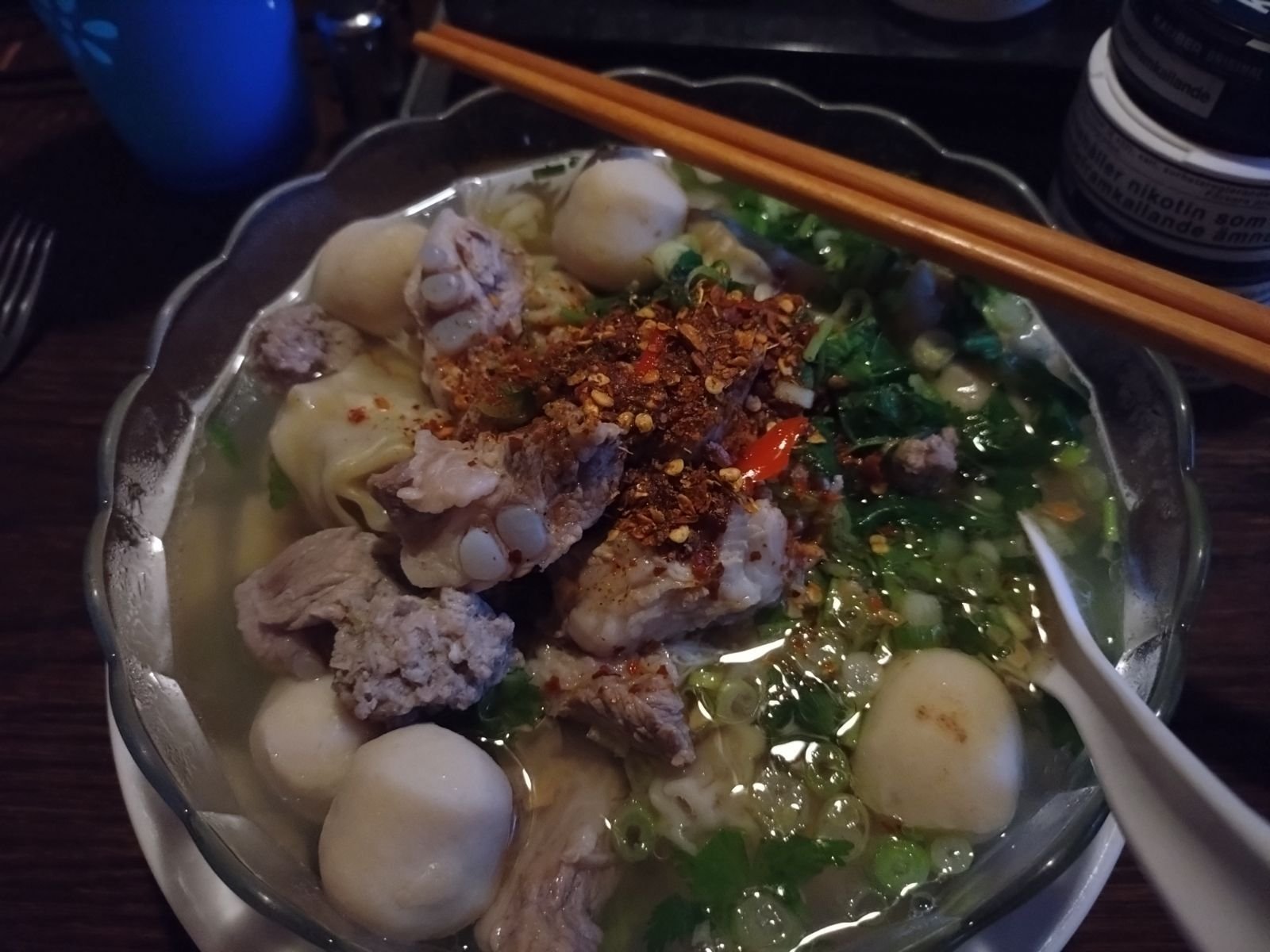 Detta inlägg gillas... ellim63 Inlagd December 1, 2023 Detta inlägg gillas... Dela Inlagd December 1, 2023 Lite grönfoder och frugans pastakuddar fyllda med fläskfärs kryddad med vitlök, korianderrot, vitpeppar och fisksås.. Och där puttrar buljongen med broskben och thailändska fiskbollar... Och i den andra kastrullen ligger pastakuddarna och gottar sig.. Sisådär frugans underbara nudelsoppa kryddad med torkad chili, chili i vinäger och koriander... en fantastiskt god kvällsmat när det är ruggligt ute, Tack älskling! 🙏💕 14 Link to comment Dela på andra sajter More sharing options...