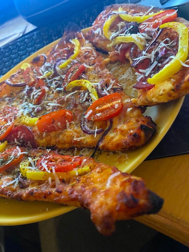 några begagnade pizzarester från frysen toppade med lite nya grönsaker fick ta en tur på pizzastenen till middag i går