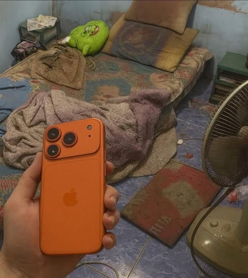 Skämtet är väl att man bor i misär men prioriterar att lägga pengar på en statuspryl, i detta fallet en IPhone. Är ju så samhället ser ut idag, bär en fet klocka och märkeskläder, kör en Audi RS6 men bo i ett råtthål i ett no-go område. Yta är allt