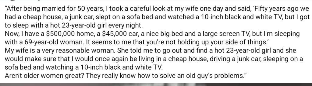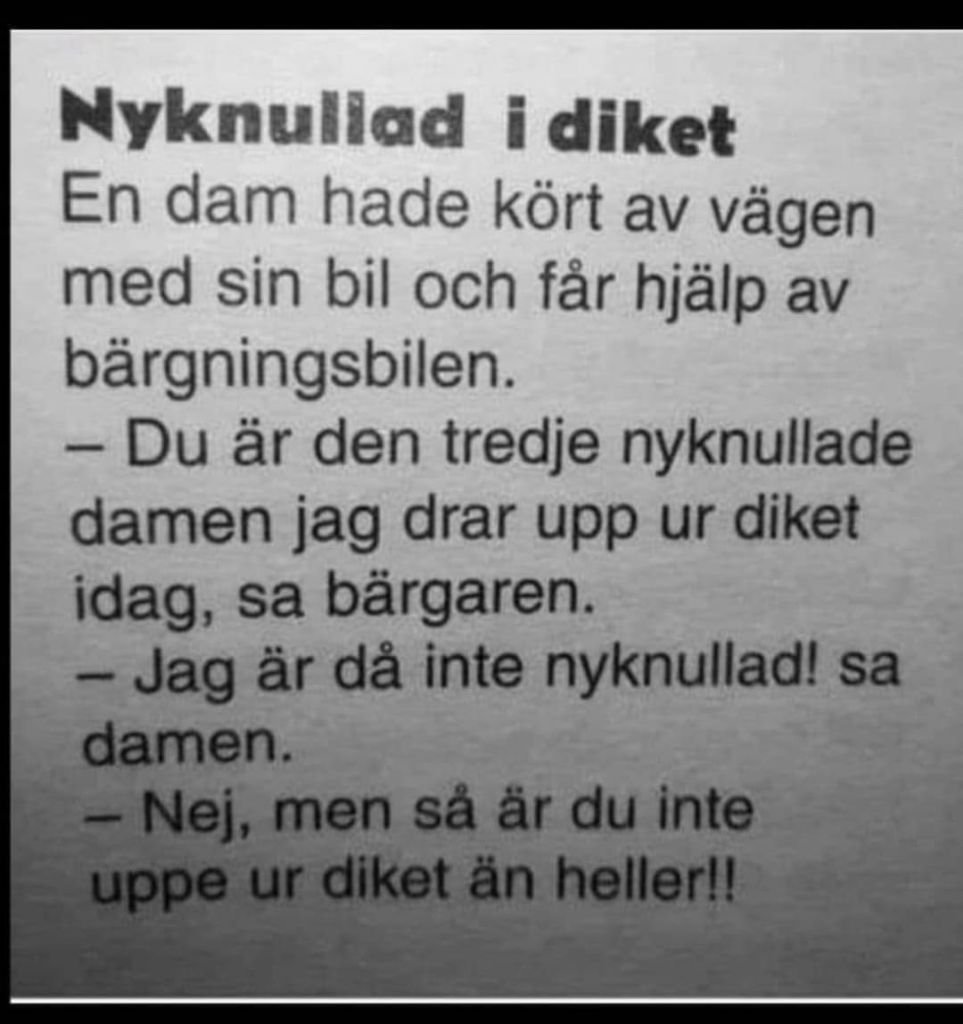 Amigo Inlagd Augusti 6, 2024 Dela Inlagd Augusti 6, 2024 (ändrad) Advokater bör inte höra en mormor från Mississippi i rätten om de inte är beredda på svar. I en liten stad i söder kallade åklagaren en äldre kvinna som första vittne. Advokaten gick fram till vittnesbåset och frågade: "Mrs Jones, känner ni mig?" »Ja, jag känner er, mr Williams. Jag har kännt Dig sedan du var en liten pojke och ärligt talat har du varit en stor besvikelse för mig. Du ljuger, du är otrogen mot din fru, du manipulerar människor och du pratar om dem bakom deras rygg. Du tror att du är en stor chef, även om du inte har hjärnan att inse att dina färdigheter bara räcker till att rulla papper. Ja, jag känner dig." Advokaten var förstummad. Han visste inte vad han skulle göra, så han pekade tvärs över rummet och frågade: "Mrs Jones, känner ni försvarsadvokaten. Mormor svarade igen: "Jo, jag känner honom. Jag har känt mr Bradley sedan jag var en ung man. Han är en lat, trångsynt fanatiker och har alkoholproblem. Han är oförmögen till ett normalt förhållande med någon och hans juridiska färdigheter är bland de sämsta i staten. För att inte tala om att han var otrogen mot sin fru med tre olika kvinnor. En av dem var din fru. Ja, jag känner honom." Försvarsadvokaten höll på att svimma. Domaren kallade båda advokaterna till sitt skrivbord och sa med mycket låg röst: "Om någon av er idioter frågar om hon känner mig, skickar jag er båda till elektriska stolen." Ändrades Augusti 6, 2024 av Amigo 1 11 Livet är fullt av val, jag valde Ford Link to comment Dela på andra sajter More sharing options...