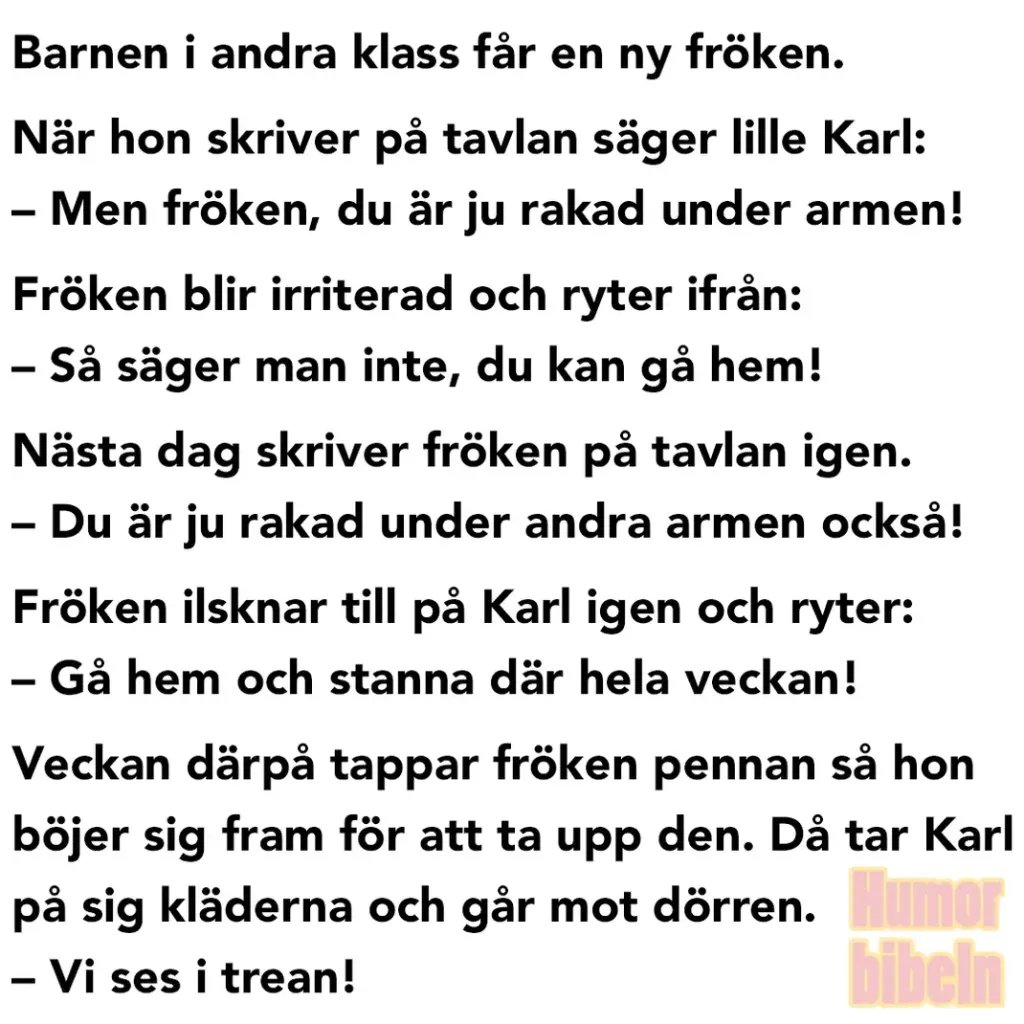 rolba Inlagd Augusti 12, 2024 Dela Inlagd Augusti 12, 2024 Löjtnat Olsson var en riktig spelevink. Nästan varje gång det var bal på officersmässen ställde han till en skandal. Bland annat var han känd för att berätta fräcka historier för damerna i sällskapet. Men denna gång hade översten förmanat honom att hålla sig i skinnet. Festen var igång och eftersom löjtnanten var en riktig kvinnokarl flockades det många damer runt honom. För visst var det så att även damerna ville höra en fräckis då och då. Olsson tvekade lite, men till slut sa han: - Vet damerna egentligen var damerna har det krulligaste håret? Och längre kom han inte innan översten dök upp och tog med honom in på toaletten där han fick världens utskällning. - Hade jag inte sagt till löjtnanten att inte ställa till en skandal ikväll kanske? - Jo, svarade han, men den här är inte fräck. Svaret är naturligtvis Afrika. Översten nickade gillande åt hans svar, öppnade toalettdörren och skrek till damerna: - Mina damer, ni kan vara lugna, det var inte kuttan. Det var Afrika! 10 Link to comment Dela på andra sajter More sharing options...
