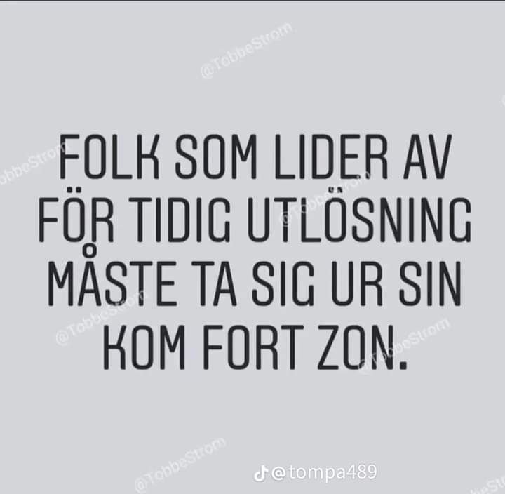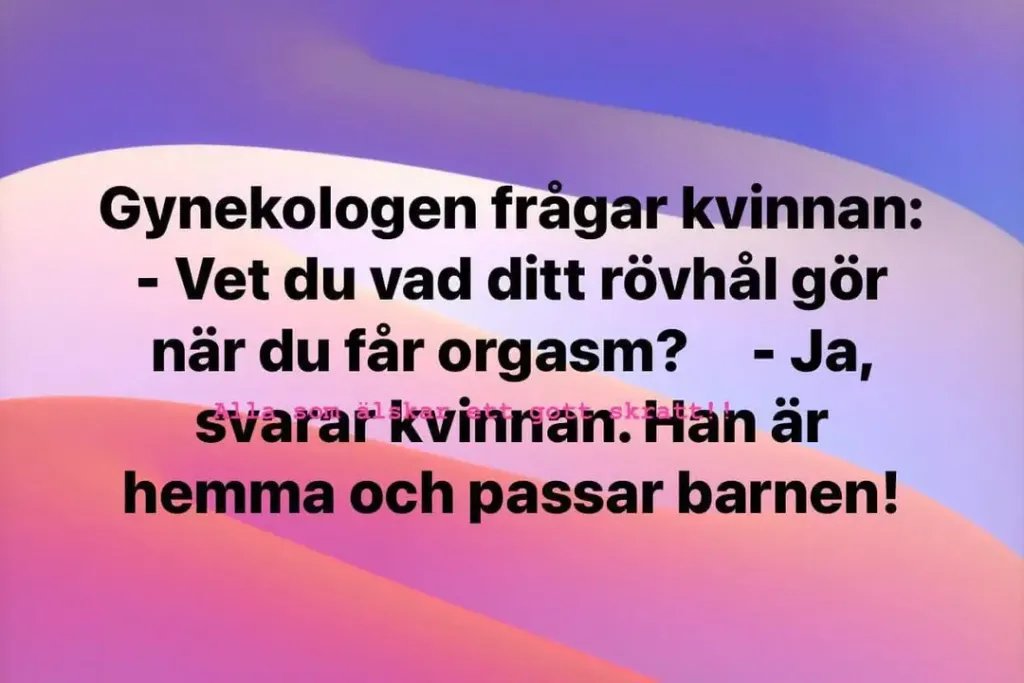 rolba Inlagd November 6, 2024 Dela Inlagd November 6, 2024 Ett ungt par älskar hejvilt hela natten. Den unga frun njuter högljutt så grannen under, farbror Sven ligger och vrider sig sömnlös hela natten. På morgonen säger farbror Sven till den unge mannen att tejpa för fruns mun för detta kan inte få fortsätta. På kvällen tejpar den unge mannen för sin frus mun och de börjar älska. Efter första numret frågar han skrikande. Blir det bra såhär farbror Sven? JA! Skriker farbror Sven tillbaka. Och så fortsätter det tills fjärde numret. Då frågar igen den unge mannen skrikande om det är ok? Då skriker farbror Sven tillbaka. Ta av tejpen för helvete! Hela trapphuset tror att du sätter på mig! 10 Link to comment Dela på andra sajter More sharing options...