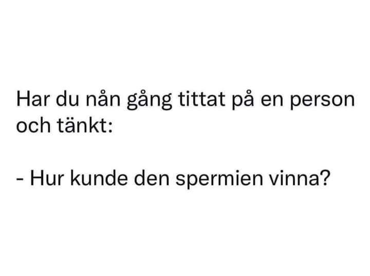 ellim63 Inlagd November 7, 2024 Dela Inlagd November 7, 2024 En mamma är på besök i Göteborg med sin lilla dotter. Hon tar taxi förbi Feskekörka där det står ett antal lättklädda damer på trottoaren. - Vad är det där för tanter?, frågar dottern. - Det är sjömännens fruar som väntar på att deras män ska komma hem från havet, svarar mamman snabbt. - Struntsnack. Det ser väl alla att det är luder, säger taxichauffören och vänder sig om. Det blir en lång tystnad innan dottern säger: - Mamma, kan luder få barn? - Självklart, svarar mamman. Varifrån tror du alla taxichaufförer kommer? 7 Link to comment Dela på andra sajter More sharing options...