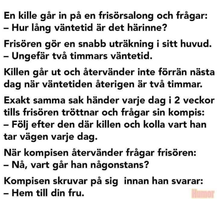 ellim63 Inlagd November 15, 2024 Dela Inlagd November 15, 2024 En vintermorgon när de åt frukost hörde de nyhetsuppläsaren på Lokalradion säga: - Vi kommer att få 8-10 cm snö idag. Vi vill därför att ni parkerar er bil på den sida av gatan som har jämna husnummer, så att snöplogen kan komma fram. Varpå Ingemars fru går ut och flyttar bilen. En vecka senare, när de än en gång äter frukost, hör de följande meddelande på nyheterna: - Vi väntar in ett nytt snöoväder idag, och räknar med snö mängder på ca 15-20 cm. Snö röjarna är tacksamma om ni parkerar bilen på den sida av gatan som har udda husnummer, så att snöplogen kommer fram. Ingemars fru går lydigt ut och parkerar bilen på den sida vägen som nyhetsuppläsarna nämnde. Nästa vecka utspelas samma scenario ännu en gång. Nyhetsuppläsaren meddelar att det väntas mer snö. - Vi räknar med 14-16 cm snö idag, vi vill därför be alla att parkera era bilar på den ... Då försvinner strömmen och radion tystnar. Ingemars fru blir mycket upprörd, och med ett bekymrat ansiktsuttryck säger hon till sin man: - Älskling, jag vet inte vad jag ska ta mig till. På vilken sida av gatan ska jag nu parkera bilen? Du vet, så att snöplogen kommer fram. Med den kärlek och förståelse i rösten, som alla män som är gifta med blondiner alltid har, säger Ingemar: - Men älskling, kan vi inte låta bilen stå kvar i garaget i dag? 1 1 11 Link to comment Dela på andra sajter More sharing options...