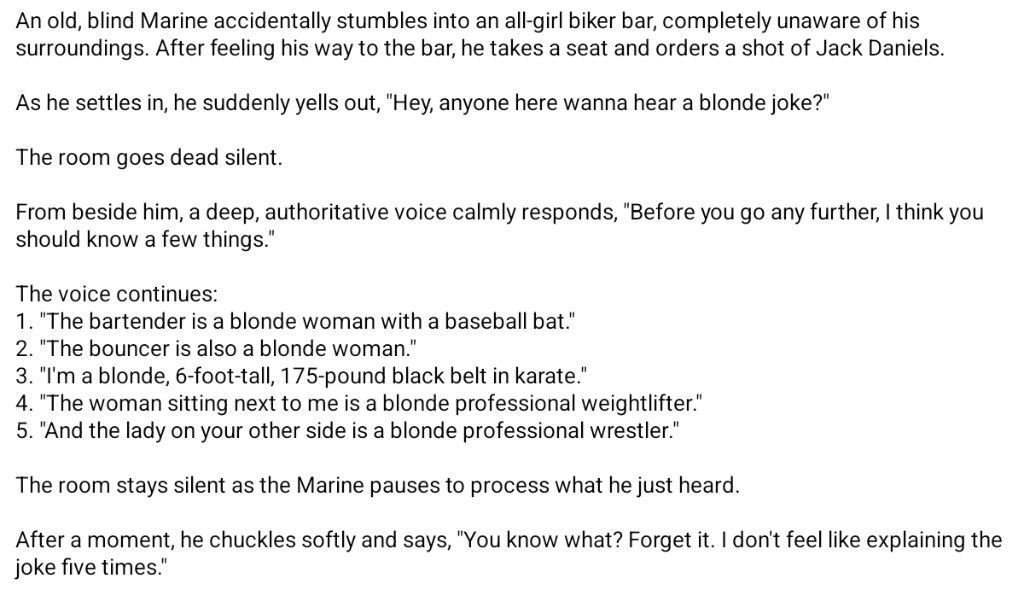 En sjöman möter en pirat på en bar. Sjömannen noterar att piraten har både träben,armkrok och en svart lapp över ena ögat.