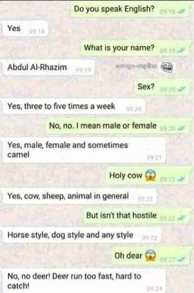 UglyFarang Inlagd Maj 6, 2025 Dela Inlagd Maj 6, 2025 -If I have a green ball in each hand, What do I have? the teacher asked his students. -Kermit the frog begging for mercy answered one of them. 1 Känner du dej gammal? Bry dej inte om det, du kanske är äldre än du någonsin varit förut, men du är också yngre än vad du någonsin kommer att bli......... Link to comment Dela på andra sajter More sharing options...
