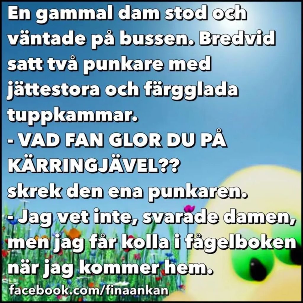rolba Inlagd Juni 8, 2025 Dela Inlagd Juni 8, 2025 En kvinna som var gravid i åttonde månaden gick på en buss och märkte efter en stund att mannen som satt mitt emot henne log mot henne. Hon tyckte det var obehagligt och flyttade till en annan plats. Då förvandlades mannens lilla leende till ett brett leende, så hon flyttade på sig igen. Mannen verkade då ännu mer road. När sen mannen efter hennes fjärde flytt brast ut i gapskratt, klagade hon för föraren som tillkallade polis som kom och förhörde mannen. När polisen frågade varför han skrattat åt kvinnan svarade han: När damen steg på bussen kunde jag inte låta bli att lägga märke till hennes tillstånd. När hon så satte sig under en affisch om en film som hette "Föräldrafällan, Tvillingarna kommer” då log jag lite. Sedan flyttade hon sig och satte sig under en skylt som sa: "Aloe Veras Liniment kommer att minska svullnaden", då blev det ett större leende. Sedan placerade hon sig under en skylt om staketbygge där det stod "En ordentlig påle från Byggmax fixade det här” och jag kunde knappt hålla mig. Men konstapeln, när hon flyttade fjärde gången och satt sig under en skylt om halkskydd där det stod ”Gummiskydd från Clas Ohlsson kunde ha hindrat den här olyckan”, då brast det för mig. Fallet avskrevs 7 Link to comment Dela på andra sajter More sharing options...