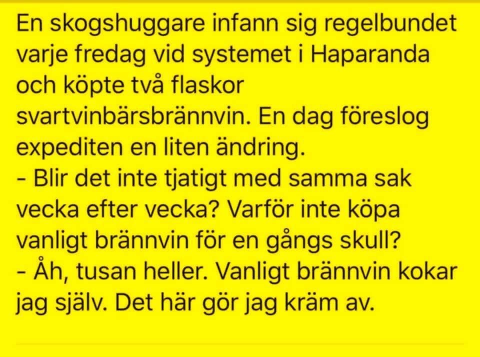 rolba Inlagd Augusti 9, 2025 Dela Inlagd Augusti 9, 2025 Jocke klev på nattåget mellan Stockholm och Luleå och smög in i sovkupén. Killen som hade underslafen sov redan, så Jocke klättrade tyst upp i sin slaf och somnade. På morgonen när han vaknade så sträckte han på sig och utan att tänka på var han var så drog han av en riktig morgonbrakare, lät ungefär som en bastuba. Då slog det honom att han inte var ensam. Så han tittade försiktigt ned över sängkanten och mycket riktigt där låg det en kille och stirrade upp på honom. Jävlar, tänkte Jocke nu gäller det att säga något. - Ehh... har tidningen kommit än? frågade han killen i underslafen. - Nej, det har den inte, svarade killen, men om du väntar till nästa station kan jag gå ut och riva lite gräs åt dej! 7 Link to comment Dela på andra sajter More sharing options...