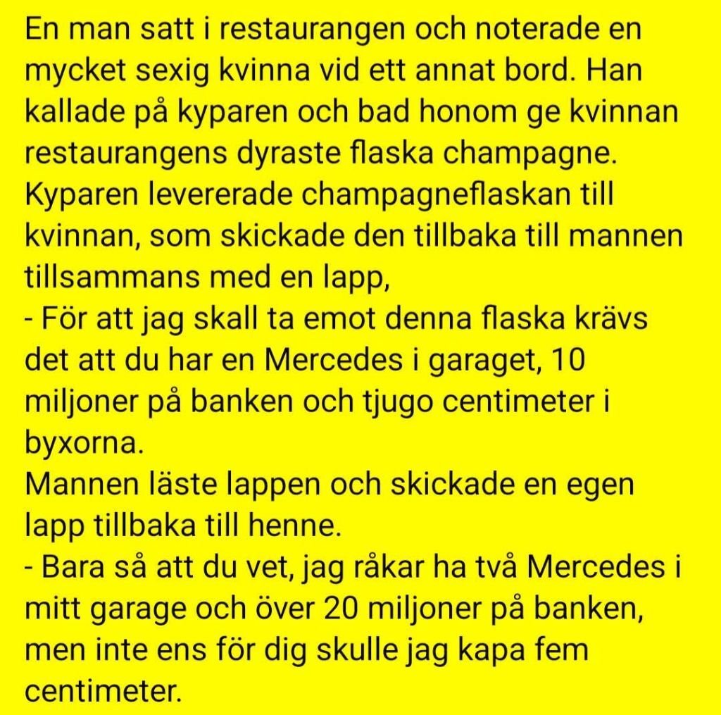 rolba Inlagd Juli 24, 2025 Dela Inlagd Juli 24, 2025 Tre män stod utanför porten i himlen hos Sankte Per. Han frågade var och en av männen: "Hur många gånger har du varit otrogen?" "Fyra gånger", svarade den förste. "Ja då får du en Opel att åka omkring i här uppe", sa Sankte Per. Han frågade nästa man: "Två gånger", sa han. "Ja då får du en Volvo", sa Sankte Per. Siste killen sa: "Jag har haft ett mycket lyckligt äktenskap och inte behövt vara otrogen." "Okej, sa Sankte Per. Då får du en Mercedes." Dagen efter träffade Opel- och Volvokillen kompisen i Mercan som hade stannat vid ett rött ljus. Han satt och grät helt förtvivlad. "Vad f-n, ska du gråta för, sa de andra. Du har ju en Merca." "Det är inte det, sa killen. Jag mötte precis min fru på cykel..." 11 Link to comment Dela på andra sajter More sharing options...