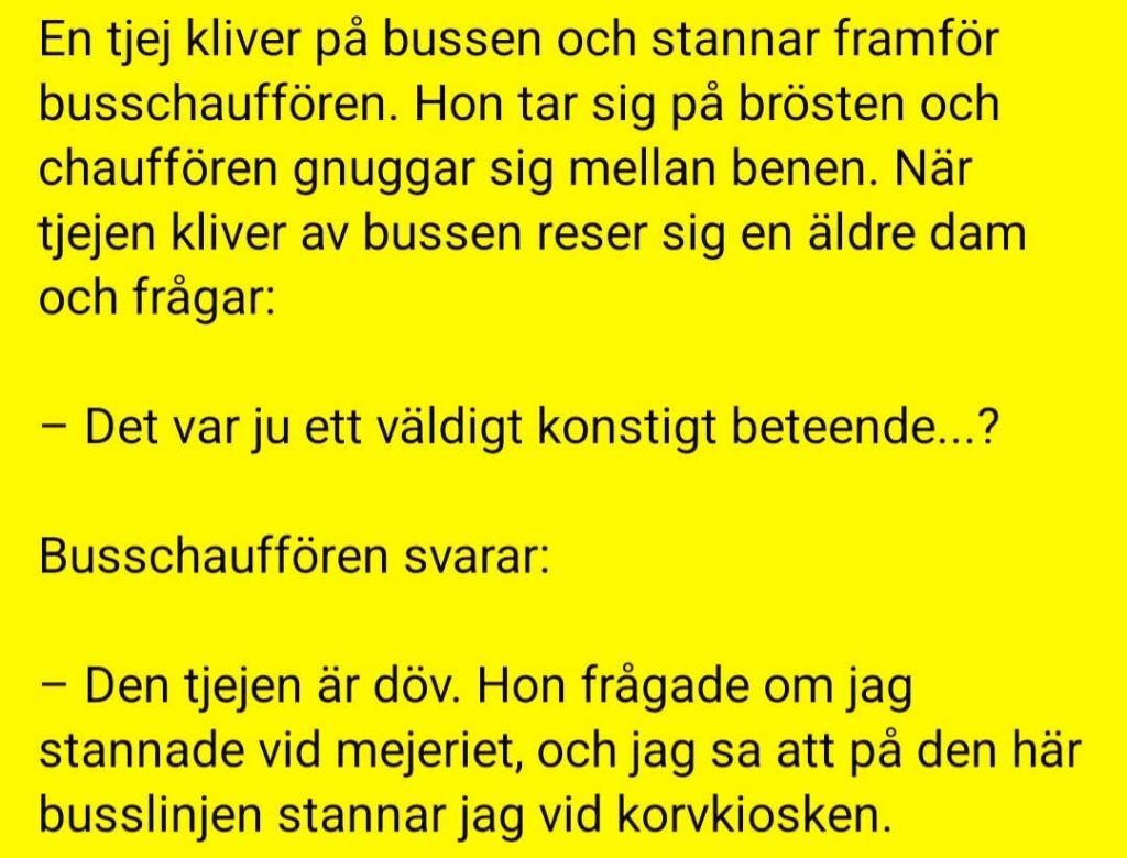ellim63 Inlagd Juli 26, 2025 Dela Inlagd Juli 26, 2025 Känsliga läsare varnas.. 🤣 Irene Blom var en vacker kvinna som tyckte om att gå omkring naken hemma i lägenheten. En dag skulle hon ut till sopnedkastet i trapphuset med en påse och klev ut naken i trappan eftersom hon inte hörde någon annan. Dörren slog i lås bakom henne. Där stod hon och visste inte vad hon skulle ta sig till när hon plötsligt hörde porten slå igen och att någon var på väg uppför trappan. Hon hade bara en tanke i huvudet, att den som kommer inte skulle känna igen henne. Därför öppnade hon luckan till sopnedkastet och körde in huvudet så långt hon kunde. Det var Svenne som kom uppför trappan. Han var en aning på lyran. När han fick se Irene Bloms inbjudande bakdel kunde han inte stå emot utan tog sig ett nummer. Hon var tyst hela tiden så att han inte skulle känna igen hennes röst. När Svenne var klar vinglade han vidare uppför trapporna och filosoferade för sig själv: ”Det är förbaske mig inte klokt vad folk slänger nu för tiden. Det var väl inget fel på henne…” 9 Link to comment Dela på andra sajter More sharing options...